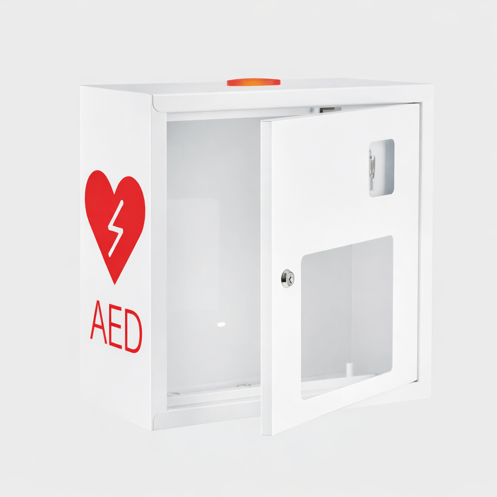 Defibrylator AED montuje się w dedykowanej szafce wewnętrznej lub zewnętrznej, która gwarantuje szybki dostęp do urządzenia i chroni je przed uszkodzeniem oraz czynnikami zewnętrznymi.